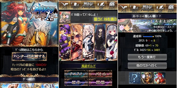「神涙のバウンティーハンター」はフィーチャフォン版・スマートフォン版両方の「GREE」に対応しており、基本プレイ無料のアイテム課金制となります。本作は、未来の地球 が舞台のカードバトルゲーム。プレイヤーは、200種類以上用意されている美女ハンターを収集・育成(合成)し、巨大生物ゴッドビーストに立ち向かう。他のプレイヤーと協力 して巨大ゴッドビーストに立ち向かうボス戦や、ガチャでより強力なハンターを獲得し、合成等で育てることができます。