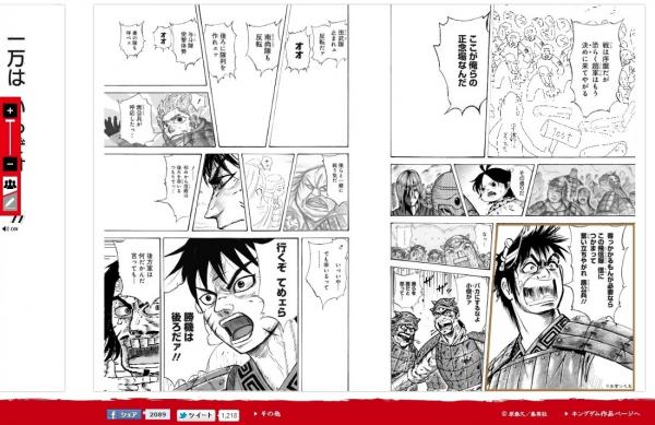 「ソーシャルキングダム」は、WEB上で展開するユーザー参加型の企画です。『キングダム』の最新刊である26巻の全コマ(約1000コマ)から、各ユーザーに1コマを選んでもらい、そのコマを模写したものをアップロードして1000人で『キングダム』26巻を描きあげる、という企画です。TwitterかFacebookのアカウントがあれば、誰でも参加することができます。