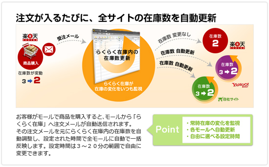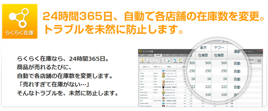 らくらく在庫なら、商品が売れるたびに、24時間365日、各店舗の在庫数を自動変更。「売れすぎて在庫がない」といったトラブルを未然に防止します。