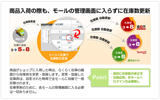 らくらく在庫は、楽天市場やYahoo!ショッピング、独自ドメインでの自社サイトなどECサイトを多店舗展開する事業者向けの在庫更新サービスです。