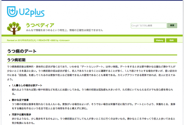 そこで、U2plusでは、「うつ病患者による、うつ病患者のための情報サイト」をテーマとした、うつ病患者が知りたい事柄について、うつ病患者自身や経験者の体験談をベースに情報を集めて公開するwikiサイト「うつペディア」をリリースした。「うつペディア」はwiki形式で作成されており、内容はもちろん、項目まで閲覧者が自由に編集できる仕様となっている。編集者はうつ病患者・うつ病経験者を中心としているが、薬品に関する事柄等、専門知識が必要な内容については医療関係者にも協力を依頼している。