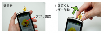 ○緊急時にスマホから専用ピンを抜くと防犯ブザーとして作動!
