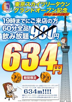 このキャンペーンは、2012年5月21日(月)~6月20日(水)までの期間中、東京スカイツリーから近い立地の「居酒屋はなこ 浅草店」、「居酒屋はなこ 錦糸町店」の2店舗に、19時までにご来店された方を対象として実施するもので、アルコール、ソフトドリンク全品を60分間何杯ご注文頂いても、通常価格990円(税込)のところ、634円(税込)にてご提供致します。