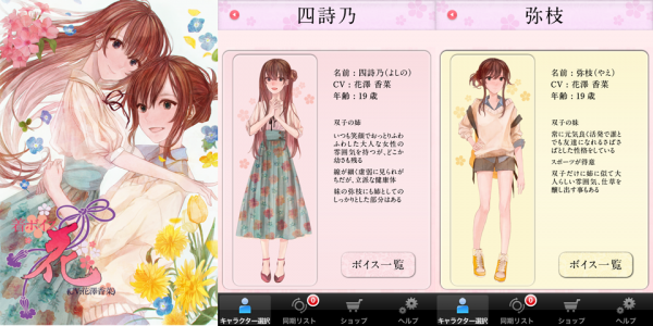 アプリ内では着信を知らせてくれる二人のキャラクター、「四詩乃」、「弥枝」の双子姉妹を一人二役で演じ、それぞれ違う二種類のボイスを楽しむ事ができます。