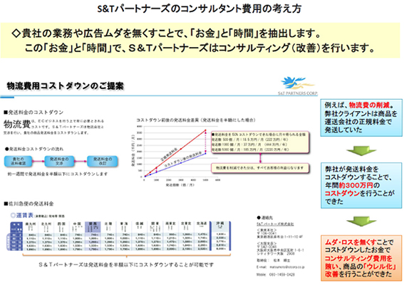 エスアンドティーパートナーズ株式会社では、物流関連の見直し、スケジュールマネジメント、業務フロー改善、ECサイト運営組織の作り方や社員教育などECサイト運営全般に関するコンサルティングを行っている。