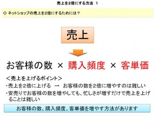 → お客様の数と購入頻度と客単価を少しずつ伸ばせば、売上は2倍になる!