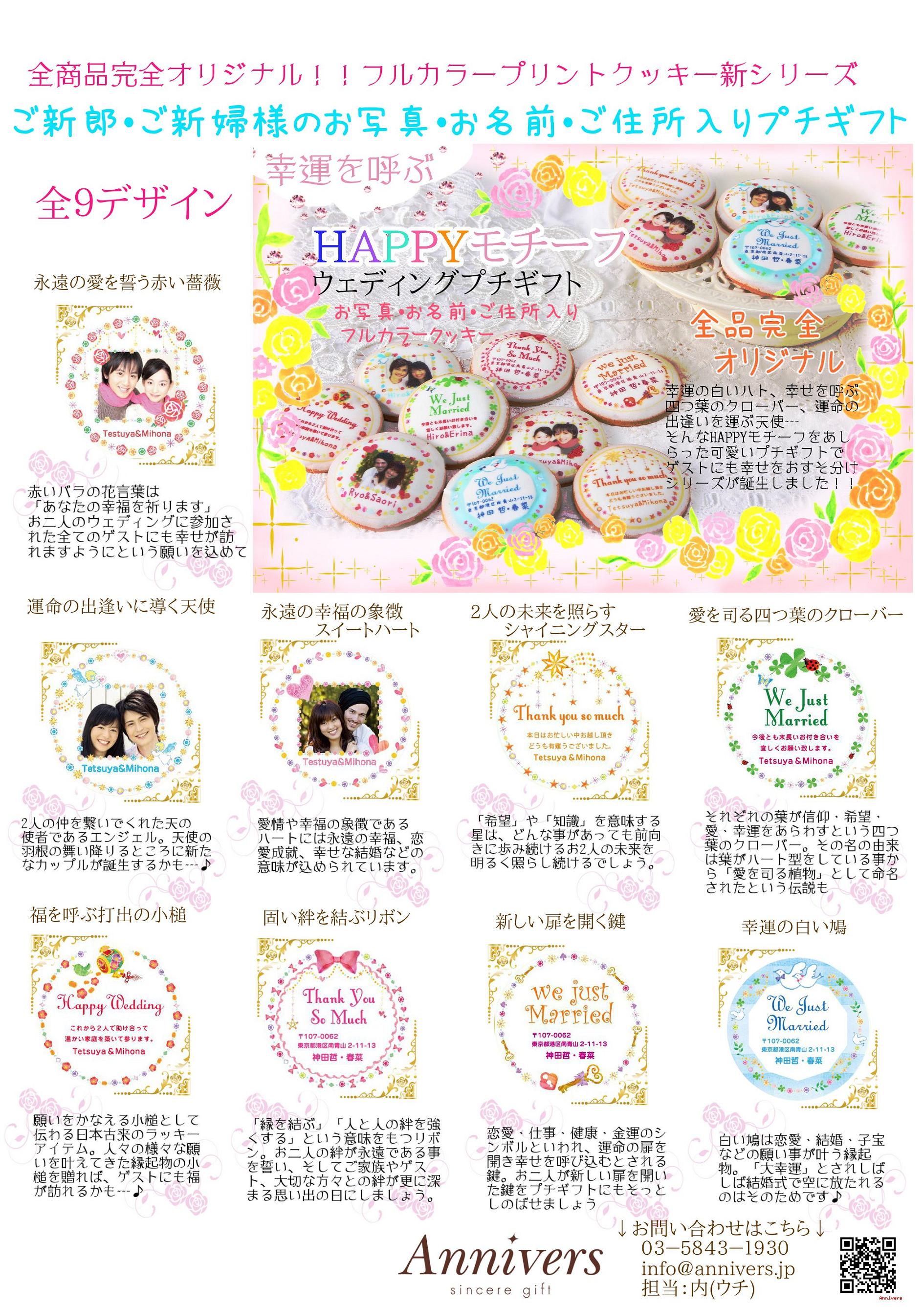 写真やロゴ・イラスト、キャラクターなどをフルカラー印刷できるクッキー【食べられるフォトクッキー】( クッキーの表面にアイシングシュガーコーティングを施し、真っ白い表面を作る事により、従来の名入れスイーツがほぼ単色プリントしかできなかった点を改良し完全フルカラープリントを実現。)にブライダル向け新シリーズ「幸運を呼ぶ!!HAPPYモチーフウェディングプチギフト」が誕生しました。