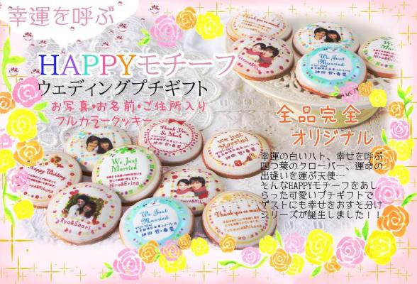写真やロゴ・イラスト、キャラクターなどをフルカラー印刷できるクッキー【食べられるフォトクッキー】( クッキーの表面にアイシングシュガーコーティングを施し、真っ白い表面を作る事により、従来の名入れスイーツがほぼ単色プリントしかできなかった点を改良し完全フルカラープリントを実現。)にブライダル向け新シリーズ「幸運を呼ぶ!!HAPPYモチーフウェディングプチギフト」が誕生しました。