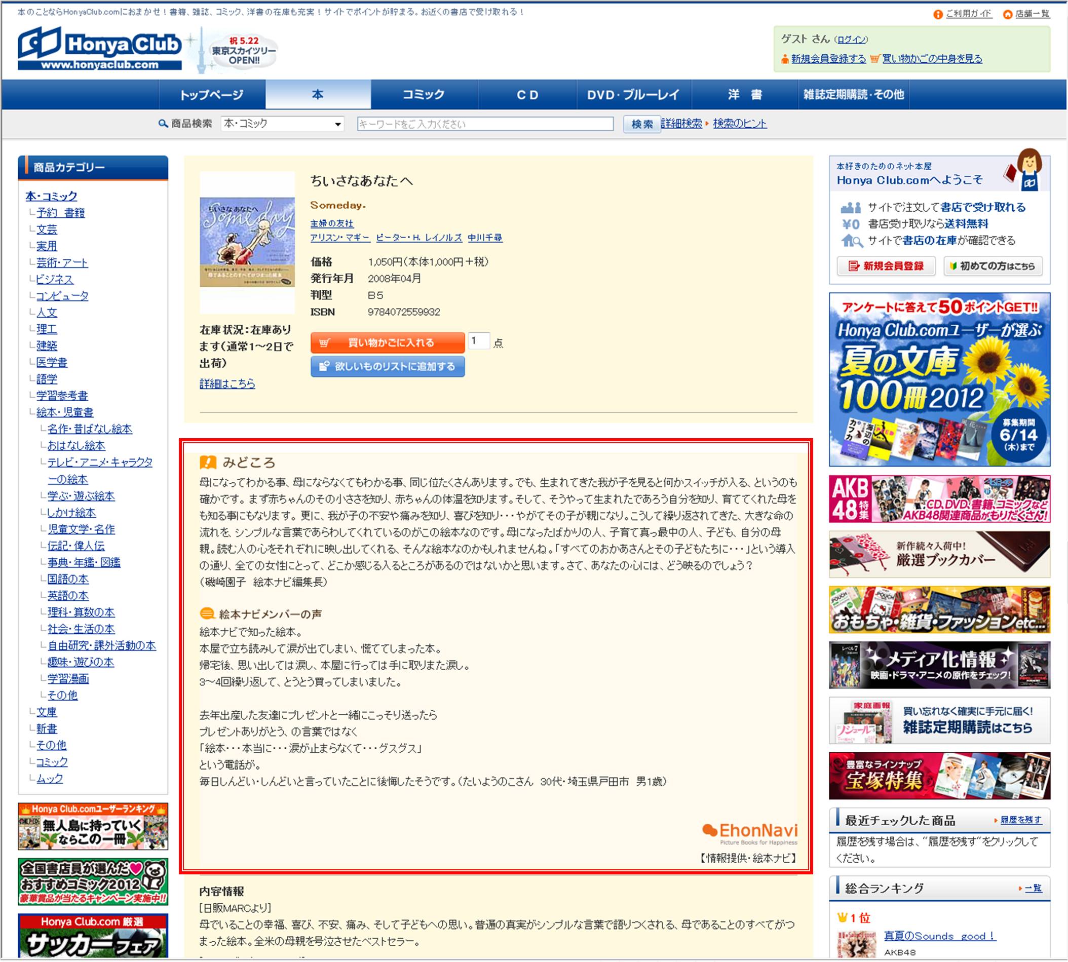 日本出版販売株式会社(本社:東京都千代田区、代表取締役社長:古屋文明、以下日販)は、絵本の情報サイト「絵本ナビ」を運営する株式会社絵本ナビ(本社:東京都渋谷区、代表取締役社長:金柿秀幸、以下絵本ナビ社)が提供するコンテンツを利用し、2012年5月28日よりオンライン書店「Honya Club.com」( http://www.honyaclub.com/