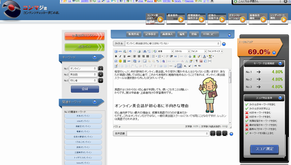 コンマジ君はテキストエディタに内的SEO要素の診断機能とWYSIWIG機能を実装したものです。HTML知識がなくても、SEO効果の高いコンテンツページを作成することが可能となります。