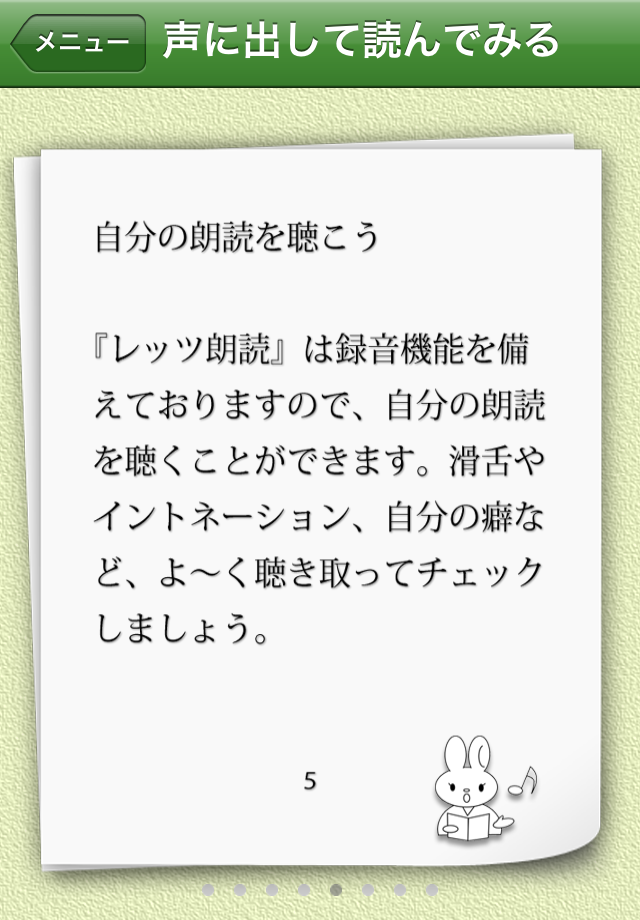 『レッツ朗読』は、自分の朗読を録音したり、聴いたりできます。自分の朗読が、どんなふうに聴こえているかを自分の耳で確認できます。自分のペースで進めることができるので、初めての方でも安心して始められます。