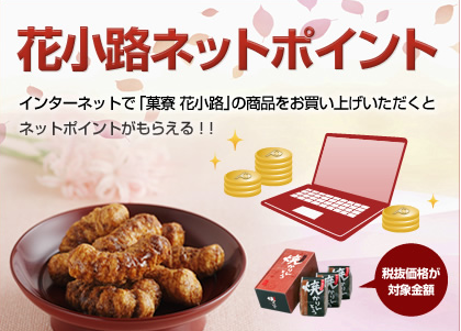 菓寮 花小路のインターネットより会員登録していただいた方が対象になり、インターネットからのご注文ご購入金額(税抜き)100円につき1ポイント付与致します。(送料分は含まれません)