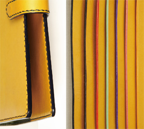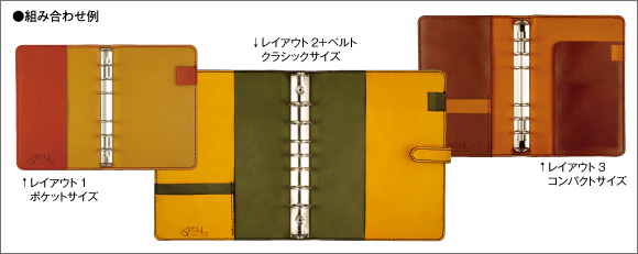 このセミ・オーダーバインダーでは、サイズ、内面レイアウト、ベルトの有無、内側・外側の革やステッチの色、コバの色などをお選びいただけます。