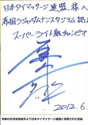 新日本キックボクシング協会(本部:東京都、代表:井原信一会長)傘下の藤本ジム(本部:東京都目黒、代表:藤本勲会長)所属の石井宏樹選手は2011年10月泰国ラジャダムナンスタジアム認定スーパーライト級王座獲得、その後本年3月11日行われたタイトルマッチ戦で初防衛に成功したもの。