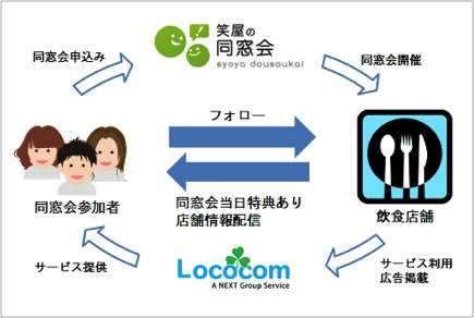 飲食店支援を行う「Lococom」と同窓会開催支援を行う「笑屋の同窓会」が連携することで、同窓会参加者、同窓会会場となる店舗、「Lococom」、「笑屋の同窓会」、すべてにメリットが生まれ、お互いの強みを活かした新たな価値提供を目指すべく、このたびのサービス連携に至りました。
