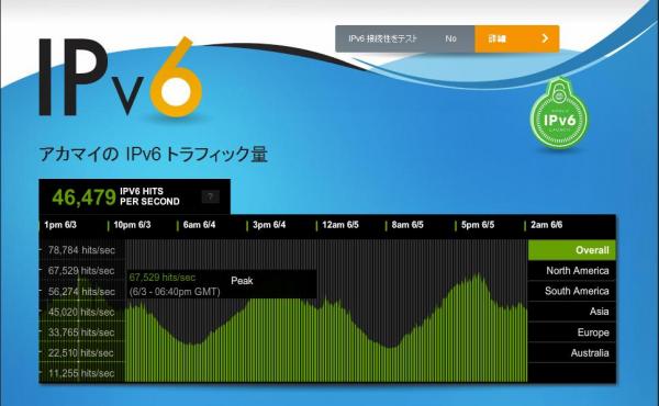 アカマイは、世界78 カ国に展開する105,000台のサーバー群によって構成されるアカマイ独自のクラウド・プラットフォーム、「Akamai Intelligent PlatformTM」から得られたIPv6ウェブトラフィックのデータを、http://www.akamai.co.jp/enja/ipv6において、リアルタイムで可視化している。