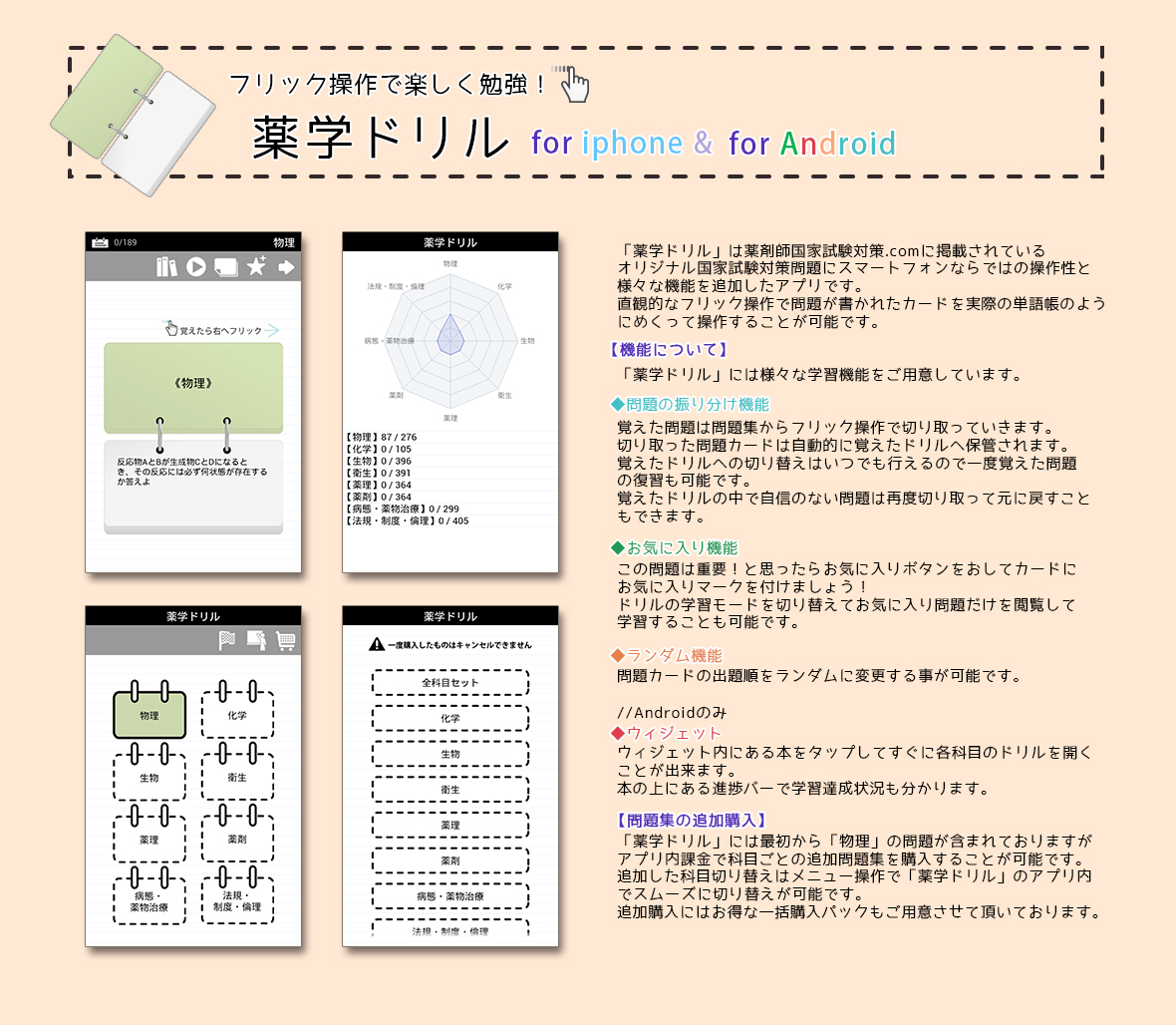 ちょっとした空き時間、移動中・通学時にお手持ちのスマートフォンで薬剤師国家試験対策が行えます。