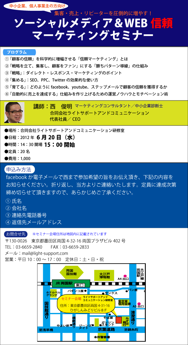 このセミナーは、ソーシャルメディア&WEB専門の中小企業診断士である同社代表が提供するもの。
