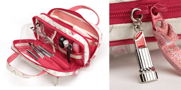 香水瓶をモチーフに、ピンクとホワイトで恋する女の子のみずみずしいイメージを表現した化粧ポーチです。