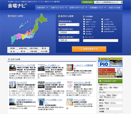 貸し会場・レンタルスペース検索の『会場ナビ』は都道府県エリアなど場所や、会議・展示会といった利用目的など、様々な視点から目的の施設を検索すること ができます。ECBBのCMS構築パッケージがもつ詳細な属性設定によって、インターネットユーザーが各施設の特長を把握しやすく、自分にふさわしい会場 を発見することができます
