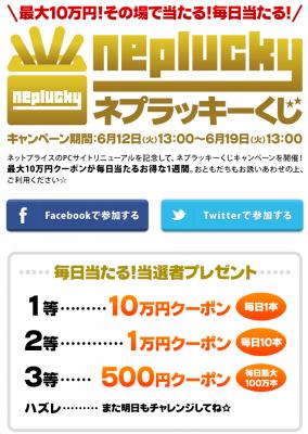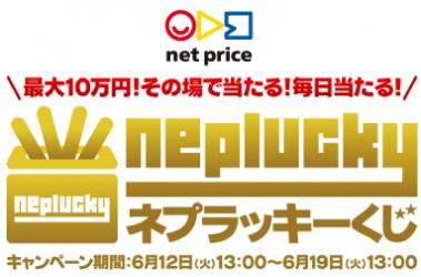 ネットプライスWEBサイトの「ネプラッキーくじ」特設ページから参加し、メールアドレスを登録すると「ネプラッキーくじ」を引くことができます。当選するとFacebook、Twitterのタイムライン上に「当選」メッセージが流れ、ご登録いただいたメールアドレスに、当選クーポン取得用のURL付きメールが届きます。期間中は毎日、1日1回「ネプラッキーくじ」を引くことができます。