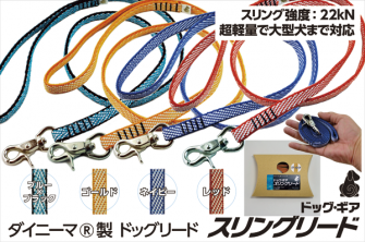 大好評のドッグ・ギア スリングリードは22kNという耐衝撃強度を誇る超高分子量ポリエチレン・ダイニーマを使用することで、60g弱という軽さ(全長90cm)で小型犬から大型犬まで対応するニュータイプのドッグリードです。
