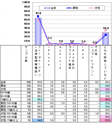 シニア世代全体のスマートフォン保有率については、「iPhone」が3.2%、「Android」が2.6%。また、タブレット端末については、「iPad」が2.4%、「iPad以外のタブレット端末」が2.6%となった。