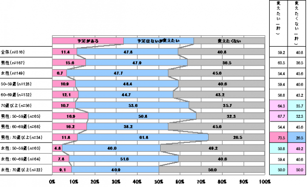 性別・年代でみると、女性よりも男性において変更したいという意識が高く、特に50代と70代においては「変えたい」という回答が7割前後と、変更意向の高さがうかがえます。