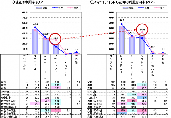 ⇒スマートフォンへの移行に際して、「ソフトバンク」へのキャリアチェンジが進む可能性が高いといえる。
