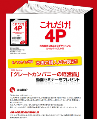 『これだけ!4P』をご購入いただいた方を対象にMBA Solution Business Collegeで提供する動画セミナー『グレートカンパニーの経営論』を無料で提供致します。