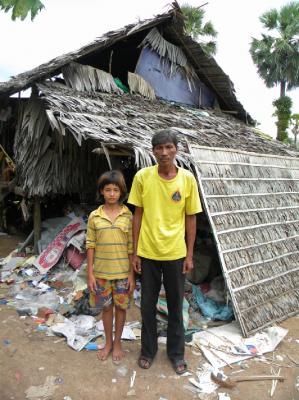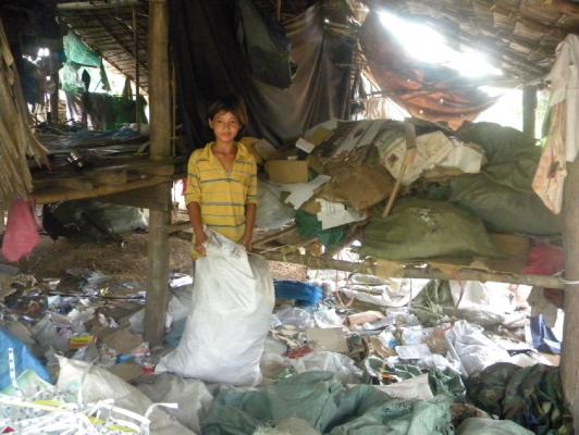 プラスチック、ビン、カン、紙、段ボール・・・。家から4~5キロ離れたゴミ捨て場やその道中、小4のスレイロットは目を皿のようにして換金できるものを探し、拾い、背中のカゴに入れます。そしてすぐに業者に売る場合もあれば、後日、換金率のより高い業者に売ることもあります(いつも頭の中で値段を比較しています)。後者の場合、拾ってきたものを一時、家に保管します。