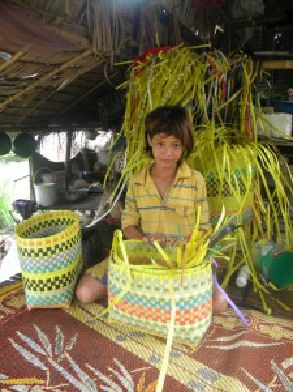ゴミ拾いの後、さらに家で1~2時間、籠作りをします。小さい籠なら1日、大きい籠は2日かかり、大きな籠の利益は(2日かけて)150円しかありません。籠の材料を買いに時々、片道2時間とその交通費をかけてプノンペンまで行くこともあります。