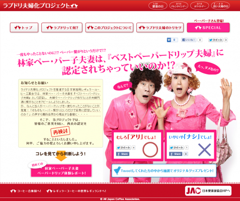 両氏の「ベストペーパードリップ夫婦」認定の是非を決めるユーザー投票プレゼントキャンペーン(2012/6/18~2012/7/31)を行います。
