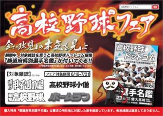 フェア対象雑誌は『輝け!甲子園の星7月号』(日刊スポーツ出版社、6/23発売)、『高校野球小僧7月号』(白夜書房、6/22発売)、『報知高校野球7月号』(報知新聞社、6/18発売)、『ホームラン7月号』(廣済堂出版、6/16発売)。対象コミックは新規読者開拓が期待される高校野球関連6作品『おおきく振りかぶって』(講談社)、『グランドスラム』(集英社)、『高校球児ザワさん』(小学館)、『砂の栄冠』(講談社)、『ダイヤのA』(講談社)、『ラストイニング』(小学館)のそれぞれ第1巻。さらに、6月21日以降、対象雑誌購入者へ先着で『おおきく振りかぶって』、『砂の栄冠』、『ダイヤのA』のいずれかの試し読み小冊子を進呈し、雑誌とコミックをクロスさせた新規読者開拓を図ります。