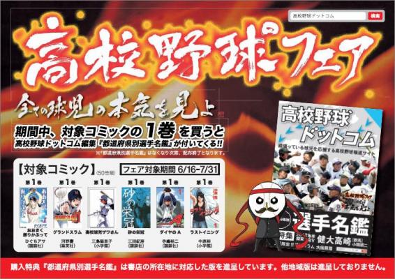 フェア対象雑誌は『輝け!甲子園の星7月号』(日刊スポーツ出版社、6/23発売)、『高校野球小僧7月号』(白夜書房、6/22発売)、『報知高校野球7月号』(報知新聞社、6/18発売)、『ホームラン7月号』(廣済堂出版、6/16発売)。対象コミックは新規読者開拓が期待される高校野球関連6作品『おおきく振りかぶって』(講談社)、『グランドスラム』(集英社)、『高校球児ザワさん』(小学館)、『砂の栄冠』(講談社)、『ダイヤのA』(講談社)、『ラストイニング』(小学館)のそれぞれ第1巻。さらに、6月21日以降、対象雑誌購入者へ先着で『おおきく振りかぶって』、『砂の栄冠』、『ダイヤのA』のいずれかの試し読み小冊子を進呈し、雑誌とコミックをクロスさせた新規読者開拓を図ります。