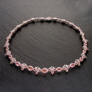 パパラチアサファイアとは、コランダムの一種で、オレンジとピンクの中間の一定の色合いのものだけをいいます。24日の番組でご紹介するネックレスは、合計30.8カラットものパパラチアサファイアを使用しています。オーバル、ペアシェイプ、ハートという異なるカットのパパラチアサファイアに、ホワイト系とピンク系のダイヤモンドをあしらい、存在感と繊細さを併せ持つ気品あふれるジュエリーです。