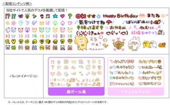 初期提供分として、約3,000点のデコメ、20点のパレット(※)を配信いたします。また今後も、季節に応じた旬の素材をはじめ、コンテンツを随時追加予定です。