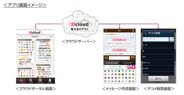 『;Dcloud』は、クラウドサーバー上にある数万点のデコメを自在に呼び出して使うことができる、スマートフォン向けのサービスです。今後、本サービスを利用した様々なアプリがリリース予定となっており、日本国内のみならず世界中でデコメが利用可能となります。