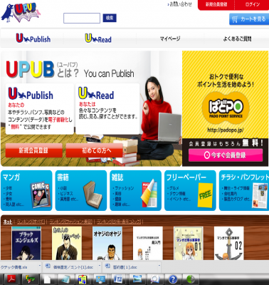 ユーパブでは販売ユーザーに最大の利益を還元し、読者にもお求めやすい価格で提供致します。今回の本格的サービス開始にあたり、「ブラックエンジェルス」「マーダーライセンス 牙」(平松伸二)、「華冤断章」(尾崎南)「拝金」、「成金」(堀江貴文)などの有料書籍の他、ぱど(フリーペーパー)やチラシ等の無料コンテンツも公開しております。