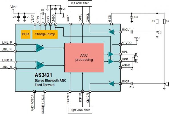 amsは、有線ヘッドフォン、ヘッドセット、イヤホンに最適な、ANC ドライバ IC の製品ラインを提供し、市場を牽引しています。今回のAS3421 と AS3422 の発表は、ワイヤレスヘッドセットに最適な ANC ソリューションの提供となります。ワイヤレスヘッドセットの多くは、 ホスト デバイスとヘッドセットの間でRF チャネルを提供するために Bluetooth を使用しています。
