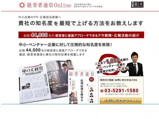 株式会社幕末(本社:東京都新宿区、代表取締役:明石智義)が企画・制作・発刊を手掛ける「経営者通信」は、全国44,000名の経営者に贈る無料経営情報誌として2009年に創刊、現在Vol.19まで発刊している。
