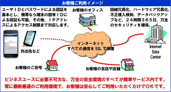 プロフェッショナルプランでは、セコムのiDCによる24時間365日の運用監視体制のもと、より堅牢なシステム環境を維持し、企業様はシステム運用に掛かる一切の負担を意識することなく、いつでもどなたにでも安全で簡単、しかも安価に、システムをご利用いただけます。