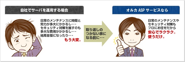 オルカは、ASPというサービス形態をとりつつ、ビジネスユースに必要不可欠なセキュリティ対策や情報保全対策を標準サービスとしてパッケージングすることでこの問題を解決し、お客様に常に安全で最適のシステム環境をご提供します。