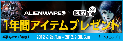 PC向けオンラインゲーム『The Tower of AION(以下、タワー オブ アイオン)』および『リネージュ 2 ~Goddess of Destruction~(以下、リネージュ 2)』を運営しているエヌ・シー・ジャパン株式会社(東京都渋谷区、代表取締役:金 澤憲(キム テクホン)は、ゲーミングパソコン「ALIENWARE」を販売しているデル株式会社(以下、デル、神奈川県川崎市、代表取締役社長:郡 信一郎)と業務提携を締結し、2012年6月26日(火)から2012年9月30日(日)までの期間、「ALIENWARE X plaync JOINTキャンペーン(以下、本キャンペーン)」を実施いたします。