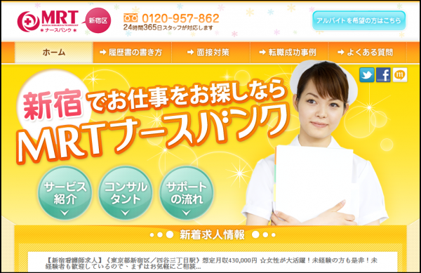 2000年、東京大学出身の医師たちによる医局の互助組織からスタートした医師・医療従事者紹介会社である株式会社メディカルリサーチアンドテクノロジー(MRT, Inc.)が運営する新宿の求人情報に特化した看護師転職支援サイト。