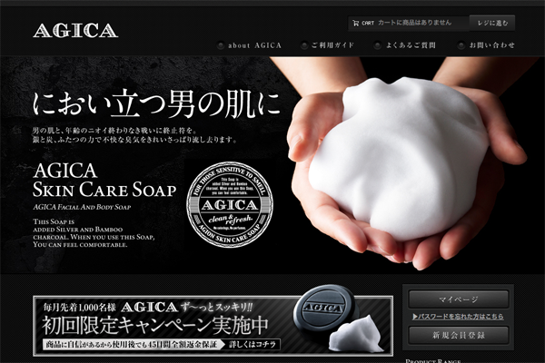 『AGICA』 は30~50代の男性に向けた加齢臭対策石けんを展開。銀と炭を配合することで、ニオイの原因となる汚れや雑菌に働きかけ、サッパリとした洗い上がりを実 現している。発売前の商品モニターの実感度は92%。「気になるニオイが驚くほどサッパリした」などの声が多く寄せられている。また「DANBIKEN 男性美容研究所」を主催する、メンズコスメのオピニオンリーダー藤村岳氏も、ニオイ対策成分として信頼している「銀イオン」と「炭」を配合した 『AGICA』を気に入っている、というコメントを寄せている。