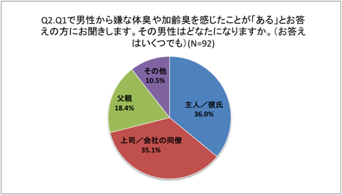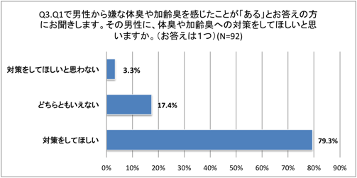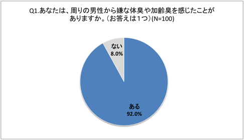 同社の調査によると、「あなたは、周りの男性から嫌な体臭や加齢臭を感じたことがありますか」と聞いたところ、なんと92%の女性が「ある」と答え た。また、その人物は誰かという問いかけ(複数回答可)には、「主人・彼氏」が44.6%と多く、次いで「上司・会社の同僚」が43.5%、「父親」はわ ずか22.8%にとどまった。また、「その男性に、体臭や加齢臭への対策をしてほしいと思いますか」という質問には、79.3%が「対策をしてほしい」と 回答。男性が思っている以上に、女性は身近な男性のニオイに対して不快な思いを持っているという事実が浮き彫りとなった。