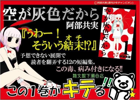 第二弾となる今回の銘柄は、週刊少年チャンピオン連載の「空が灰色だから」(阿部共実)。少年少女らを中心に、“うまくいかない”日常をコミカルかつ痛々しく描くオムニバス作品集です。pixivやブログ等のwebで発表していた作品が人気を集めていた著者・阿部共実の初の単行本で、発売直後に完売店が続出した注目作品です。