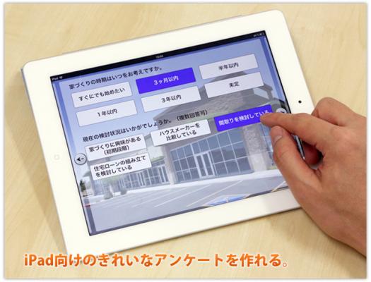 自由に設定できる背景画像の上をアンケート項目が横滑りするiPadらしいユーザーインターフェイスを採用しました。もちろん、横方向のフリック(指を横方向に滑らせる操作)で、アンケートページをめくれます。画面の文字とボタンは大き目で、見やすさ、操作しやすさに配慮しました。