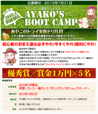 2012年6月に実施した初心者向けプログラム『あやこのトライ実践ドリル※』の成果を審査するブロンズ会員以下限定のコンテストです。『あやこのトライ実践ドリル』に参加しているブロンズランク以下の会員の実践度、理解度を審査し優秀者5名に賞金が贈られます。